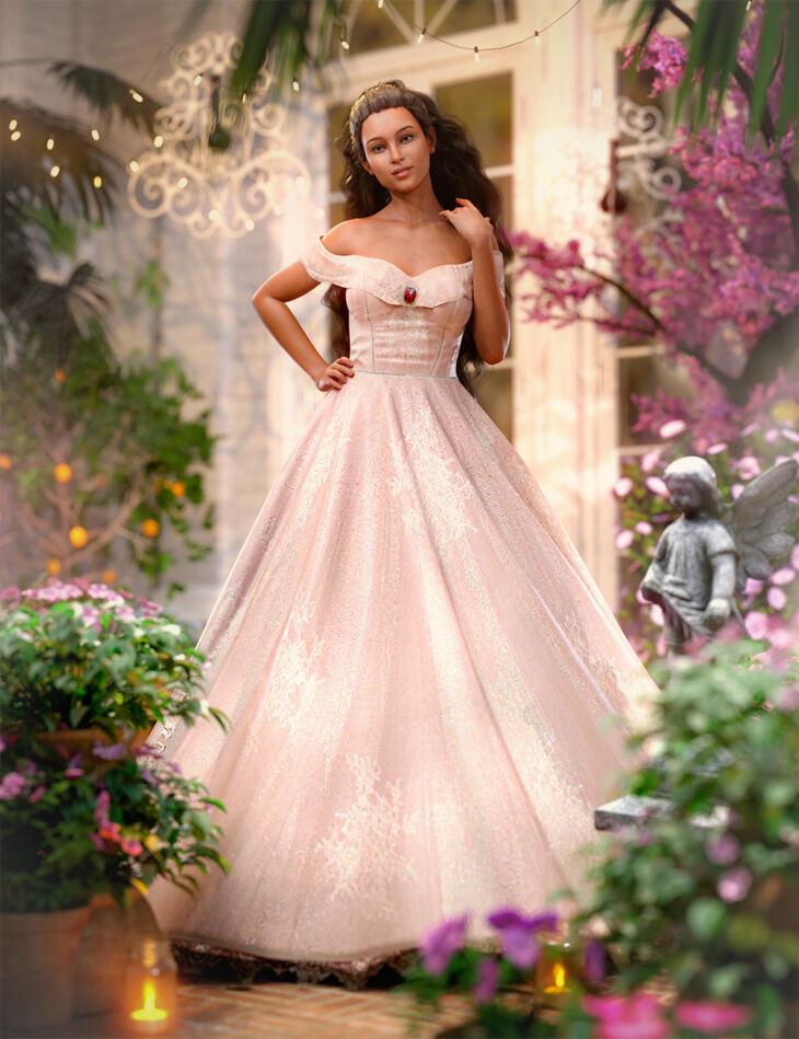 The dForce Wishful Princess Outfit for Genesis 8 and 8.1 Females is an elegant gown complete with a flowing decorative train and stunning high heels.