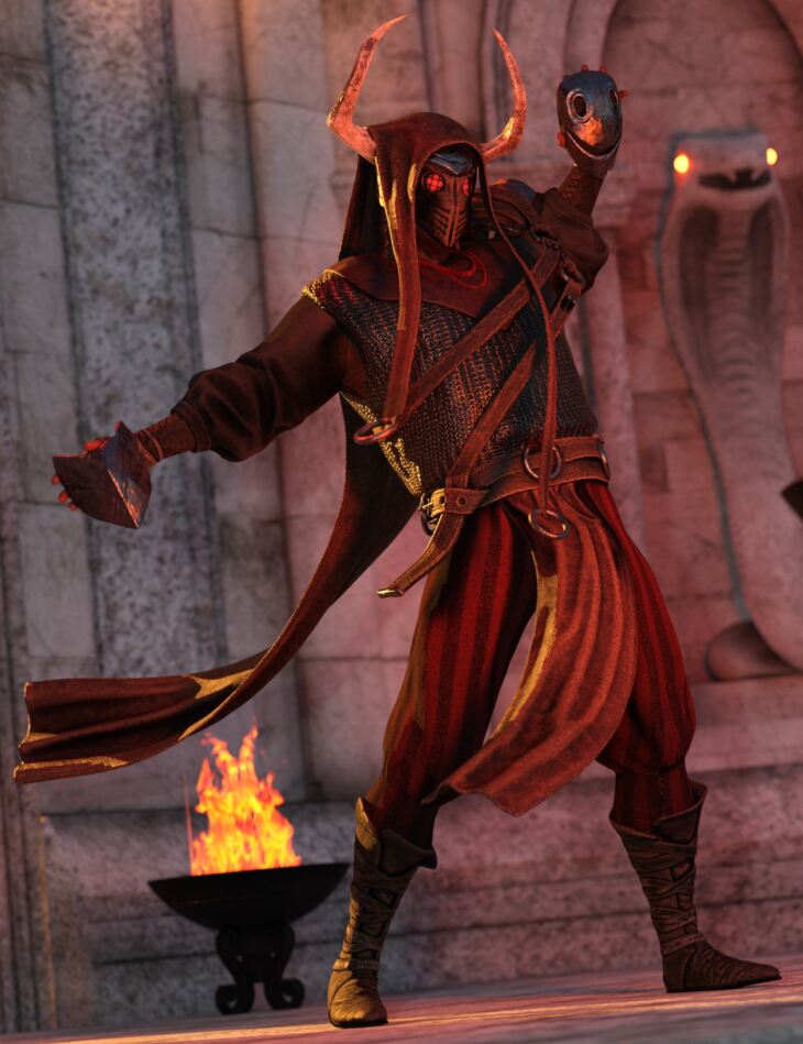 This 14-piece set consists of a shirt, vest, trousers, shoulder plate, boots, belt cloth, balaclava, helmet, chain, gloves, cloth, and 3 different masks. It comes with multiple supported shapes, shaping morphs, and pose controls so you can customize it as your character needs.