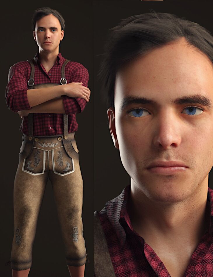 Dion is a country boy at heart and a new realistic character for your Genesis 8 Male with 6 eye color options, 3 SSS presets, and 4 eyebrow options.