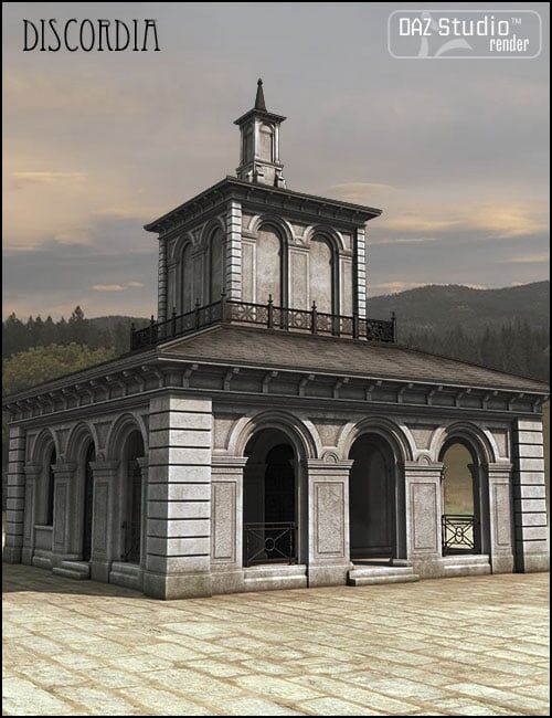Discordia is a highly detailed 3D building featuring a modeled interior and exterior, arched windows, cast iron work and a covered entrance. The set is split into two sections for increased flexibility.