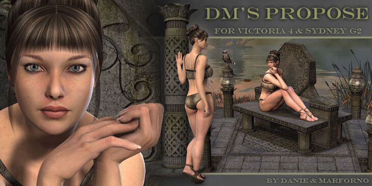 DM has combined 9 props, all with beautiful, high-resolution textures and 60 poses each for Victoria 4 and Sydney G2, to bring you a "must-have" for your runtime. And there's more ... there are 4 ready-to-use scenes, all with their own custom light sets and camera settings.