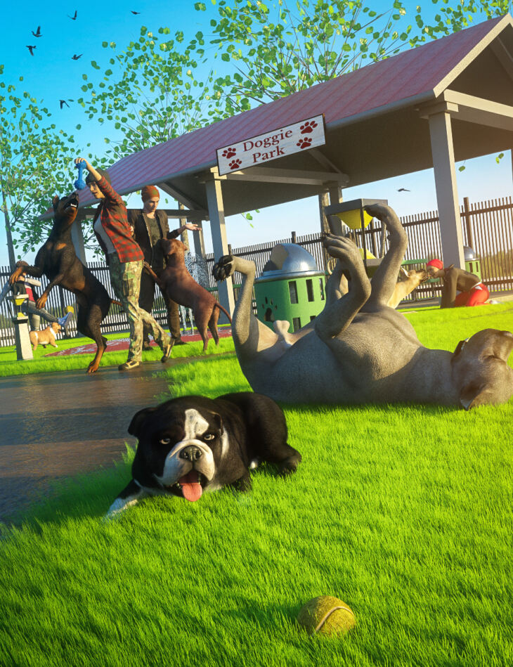 Dog Park, featuring fence with rigged gate and latch, water fountains, play areas, doggie themes garbage or other waste receptacles, human/canine combo water fountain, pavilion, picnic tables, tree and landmass with grass.