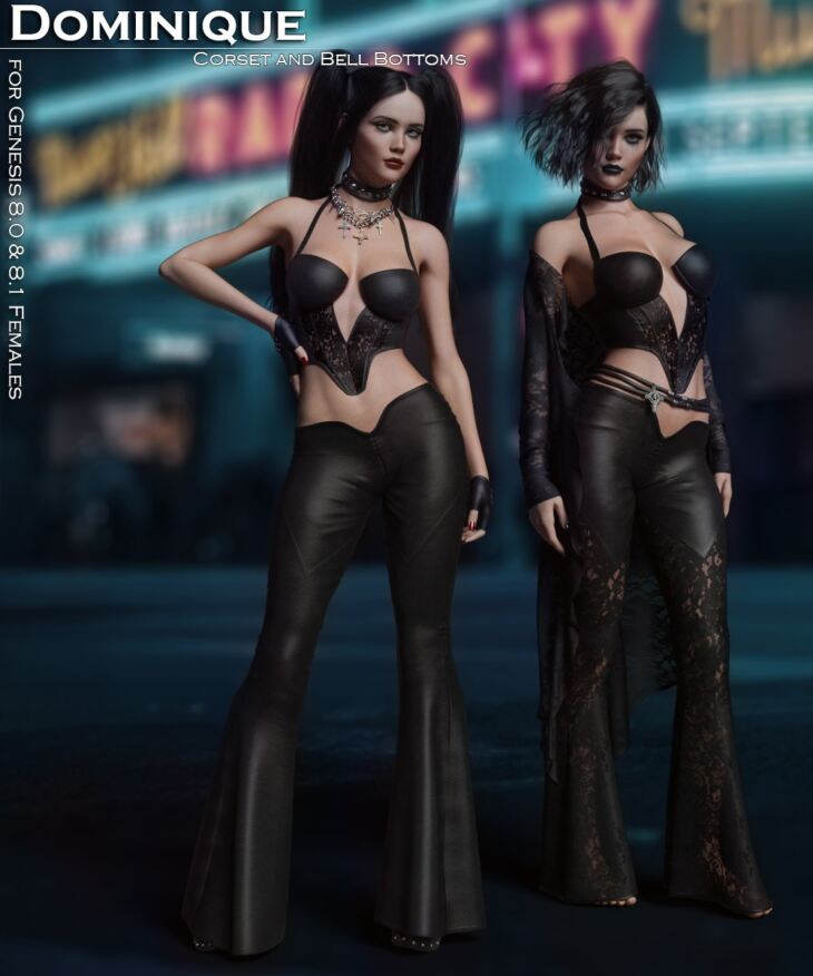 Introducing Dominique for Genesis 8 and 8.1 Females. Dominique is a 2-piece outfit that includes a leather corset top and leather bell bottom pants.