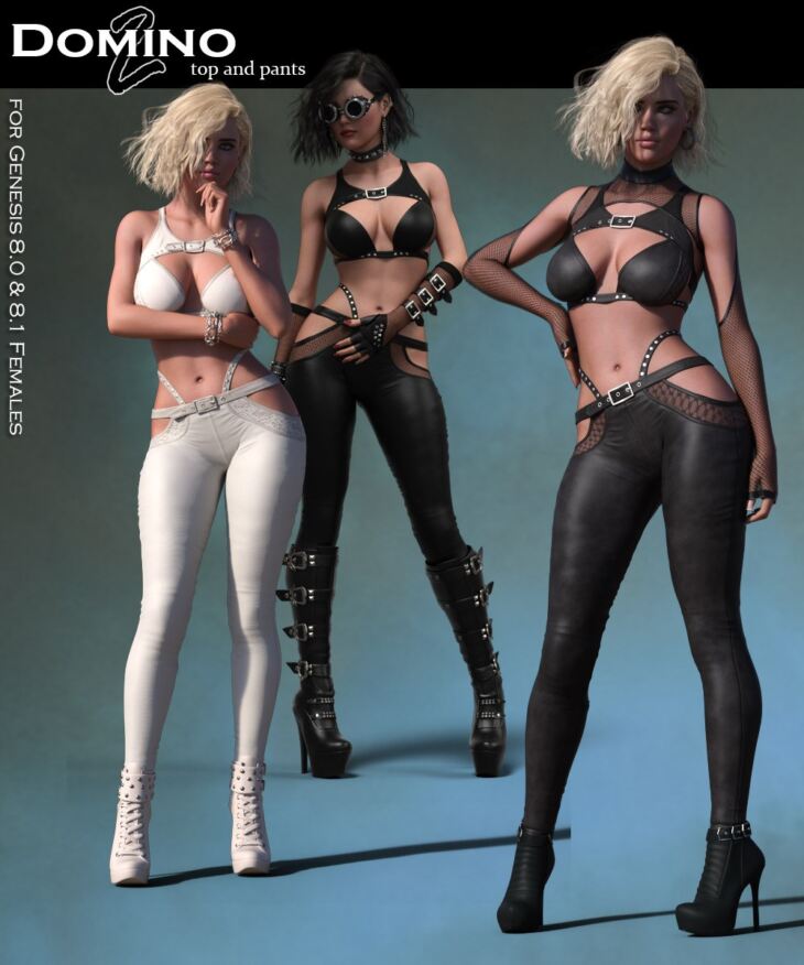 The Domino 2 package is a sexy new set for the Genesis 8 and 8.1 Females that includes a coordinating top and pair of pants.
