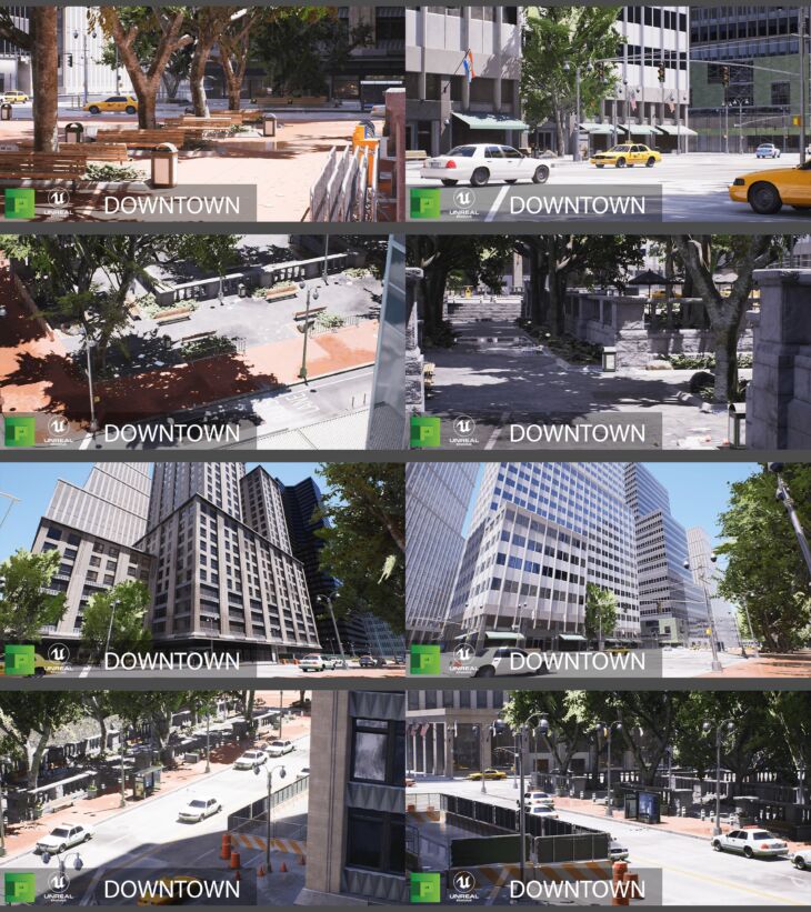DownTown is intended to be a one stop shop for all your big city needs. With modular roads, tall skyscrapers, a central park area and loads of props, this is sure to set you off on the right track for your big city projects. We left no stone unturned when creating this pack, having an asset list of well over 200, and stress testing it inside a massive level with a park as the center piece. We intended this to be design. There's cars, scaffolding, a mixture of road types, 6 building styles, foliage, picnic area, litter, audio and more.