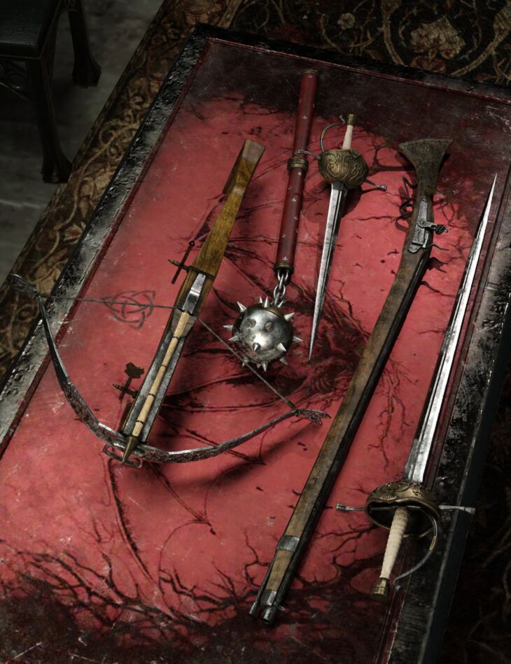 Introducing the Draconna X weapons Collection! Finely forged in the fantasy tradition, blended with medieval and gothic elements, this lethal weapons pack includes a sword, gauche, crossbow, rigged flail, and musket.