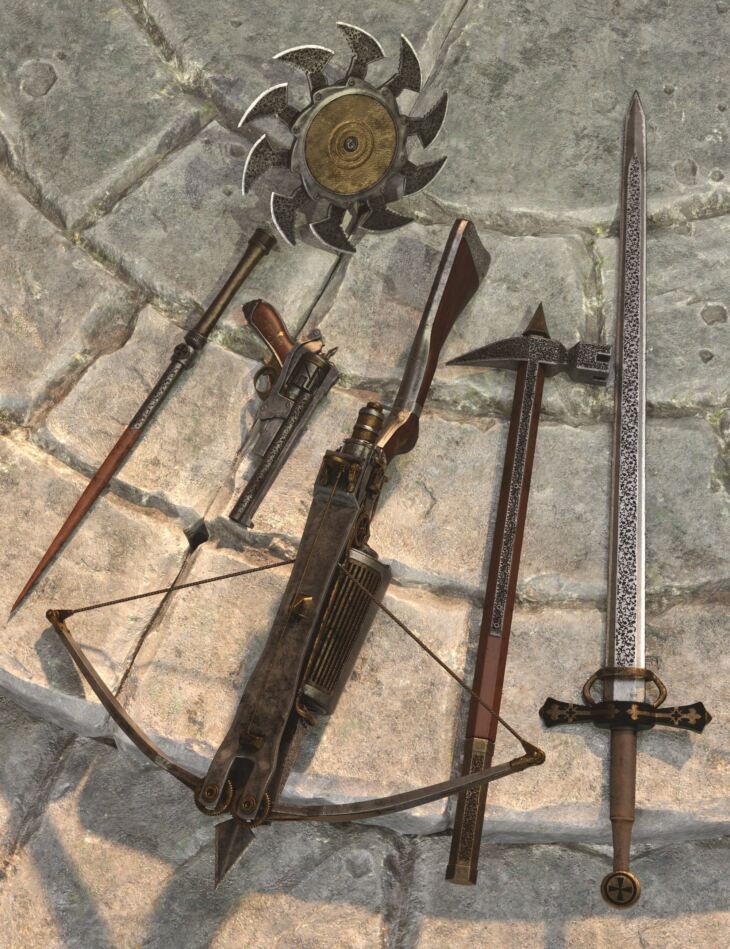 Introducing the Drusilla Weapons Collection. Forged in the tradition of steampunk blended with fantasy, this lethal weapons pack includes a crossbow, buzzsaw, revolver, stake, hammer, and sword.