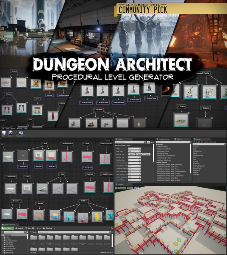 Dungeon Architect is a procedural level generator. Design the layout of your levels using powerful node based systems. Create key-locks, teleporters, cyclic paths and much more!