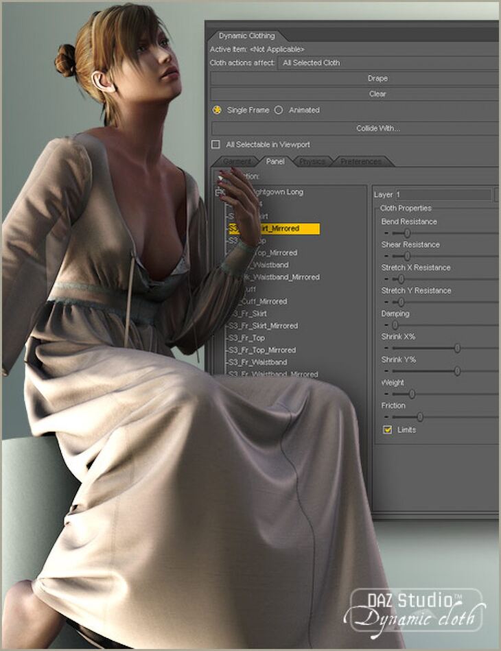 With the ability to control every individual property across every single panel of your dynamic clothing, you are in complete Control. Speed up your dynamic clothing simulations by controlling the number of calculations performed in each drape cycle. Add wind to make your dynamic clothing billow around your figure. Lower the force of gravity and make your figures clothes float as if they were suddenly walking on the moon. The possibilities are endless!