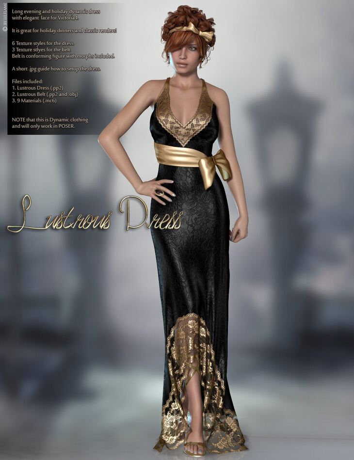 Long Evening dinner lace dress with an elegant cut makes it perfect for all occasions. Conforming belt with bow. Belt includes body morphs and adjust morphs.