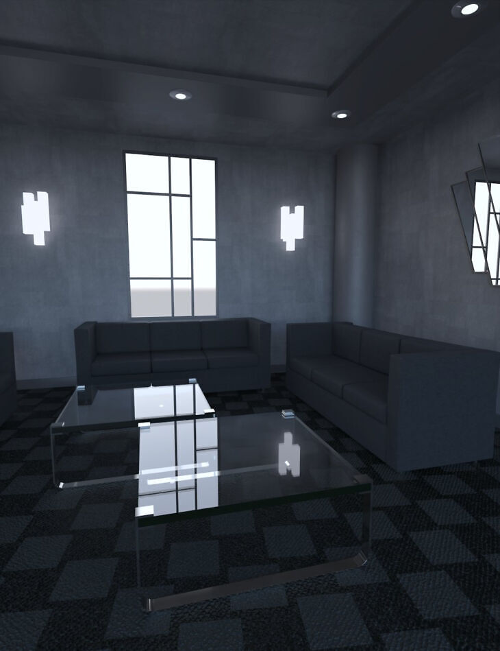 Dystopian Room Interior features a Vignette scene with working-door, mirror, sofa, and tables, Optimized for Studio with Iray.