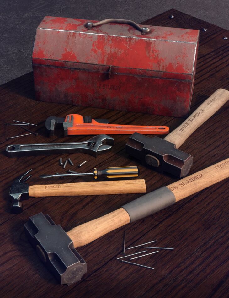 Each tool is highly detailed with large textures and ready to be handled by the Genesis 8 Female. The variety of tools includes a claw hammer, a crescent wrench, nail and screw scatter, and three types of sledgehammer. In addition, there's a poseable toolbox that opens and closes and an adjustable pipe wrench.