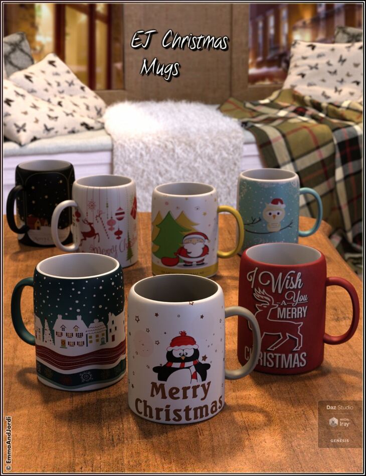 EJ Christmas Mugs is a collection of mugs to use in all your Christmas scenes. Each mug has three versions: one as a standalone prop that you can place anywhere, and left and right hand. Poses for left and right hand for Genesis 8 Female(s) are included, and these coffee cups are a must-have for the holiday season!