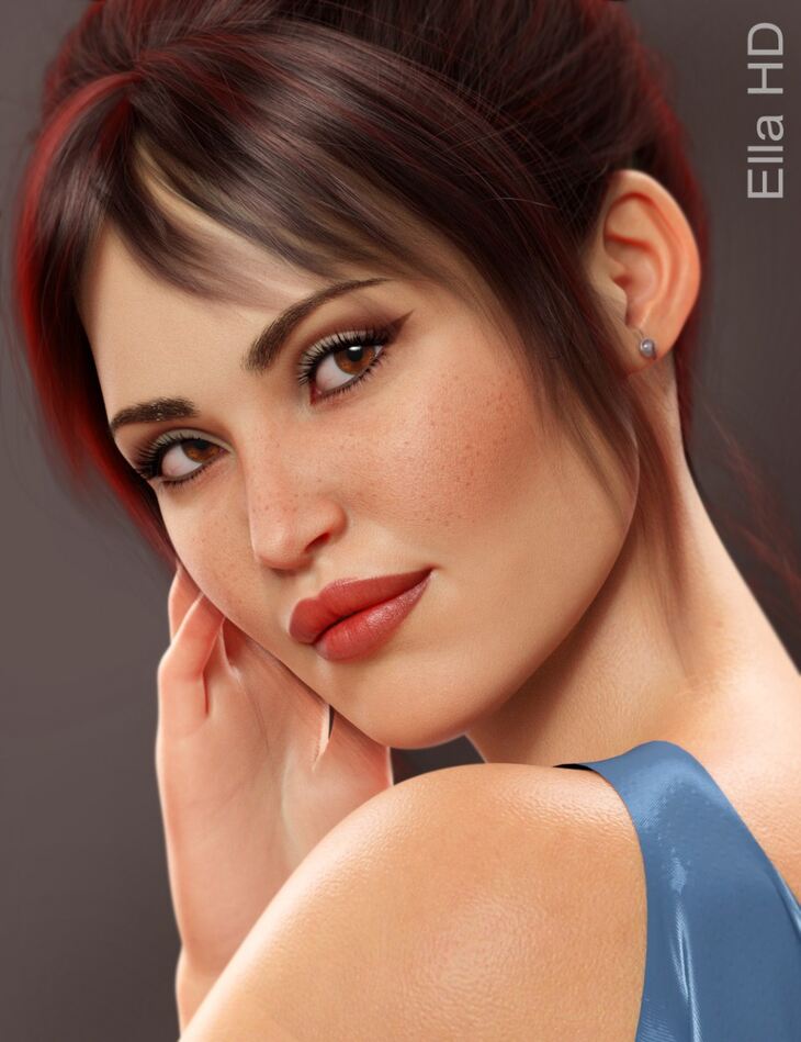 Meet Ella HD, a sultry character for Genesis 8 Female with original hand-sculpted features and realistic skin from high-quality photo references.