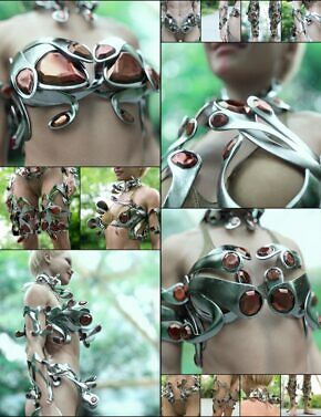 The set includes 11 independent pieces: a bra/chest piece, a metal hips piece with leather panties, neck, arms, forearms, thighs, and shins ornaments.