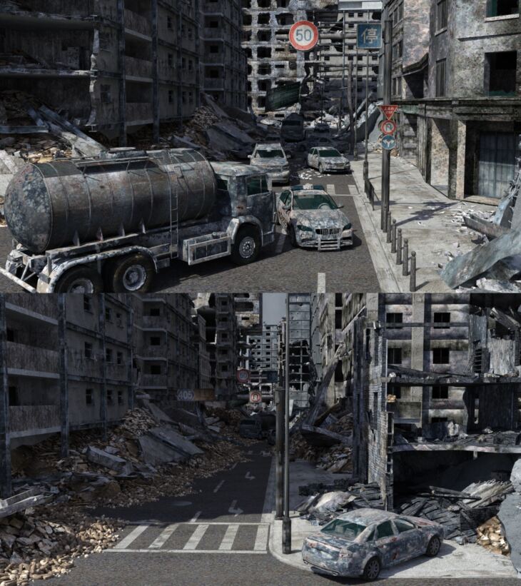 This project wished to illustrate the devastation of such an event. The scenes can be used for post war, apocalyptic catastrophe, earthquake, or zombie plague.