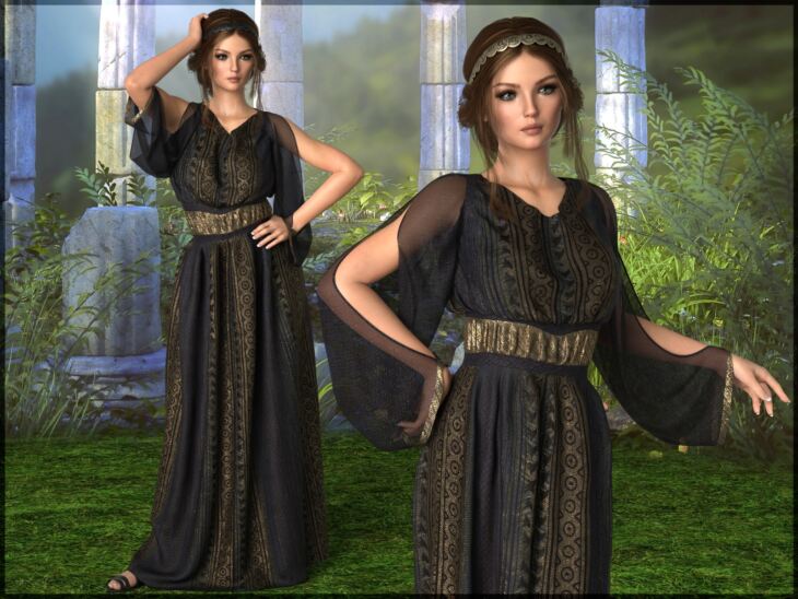 dForce - Tadema Dress for G8F by Lully. This set includes 15 Styles, of which 08 are "Any Colour" options as well as a variety of metallic accent choices.