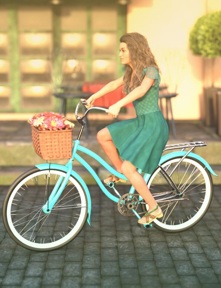 The bike is rigged to steer left/right, pedal, and spin the wheels. It also comes with twelve different material options and a selection of poses for Genesis 8 Female and Genesis 8 male.