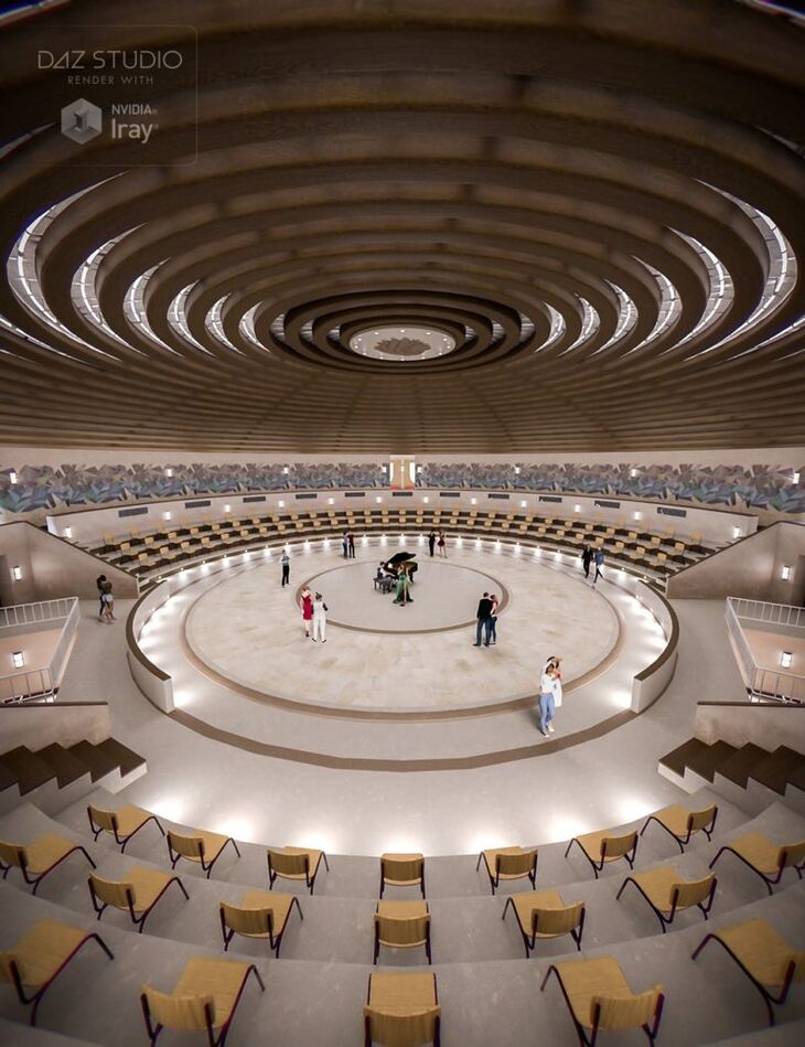 A complete building environment, both inside and out, with a reception area downstairs and amphitheater upstairs.