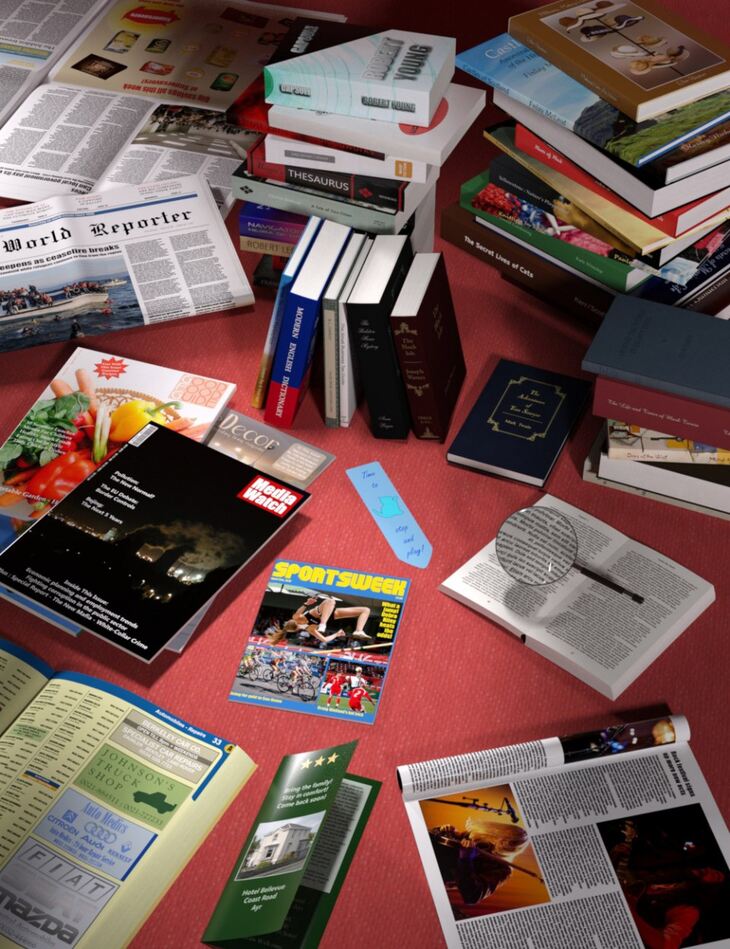 The magazine stack has 44 morphs, and there are 4 single magazines. Also includes 2 bookmarks, 3 newspapers, open/closed leaflets and phone directories. And if you're short-sighted, there's even a large magnifying glass for close-up reading! The pack has separate Iray and 3Delight versions with props and presets for each renderer.