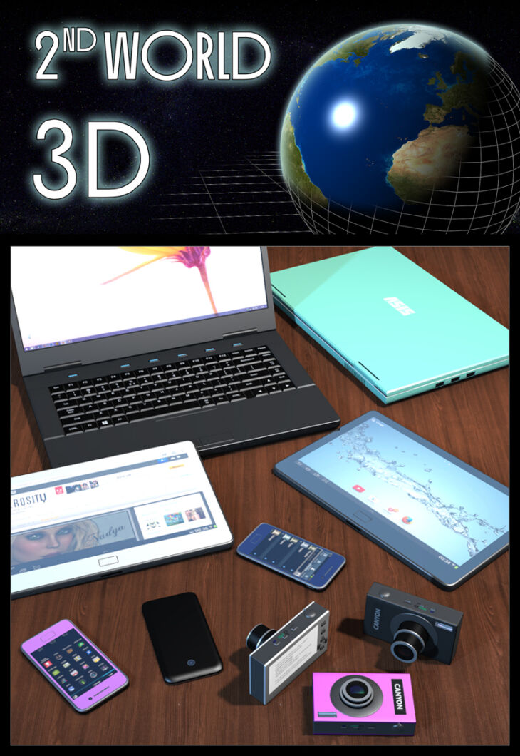 A set of 4 realistic electronic devices to use in various renders. It includes a laptop, tablet, digital camera and a smartphone. Each item has a few material presets to change the color and options to change the image on the screen.