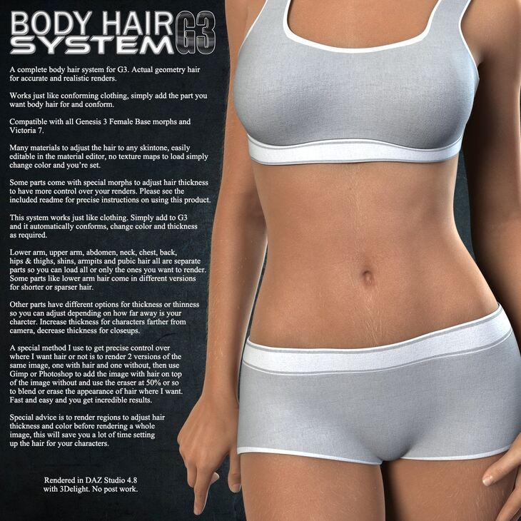 This system works just like clothing. Simply add to G3 and it will auto conform, change color and thickness as required. Lower arm, upper arm, abdomen, neck, chest, back, hips & thighs, shins, armpits and pubic hair all are separate parts so you can load all or only the ones you want to render.