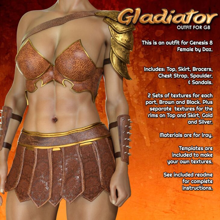 This Package contains the "Gladiator Outfit" meshes for Daz Studio and Iray, for use with Genesis 8 Female.