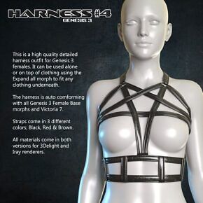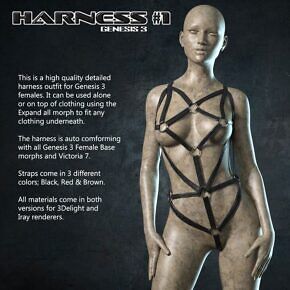 The Harness auto conforms with all Genesis 3 Female Base morphs and Victoria 7.