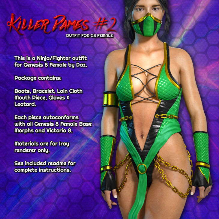 This Package contains the "Killer Dames #2" set of meshes for Genesis 8 Female for use with Daz Studio and Iray.