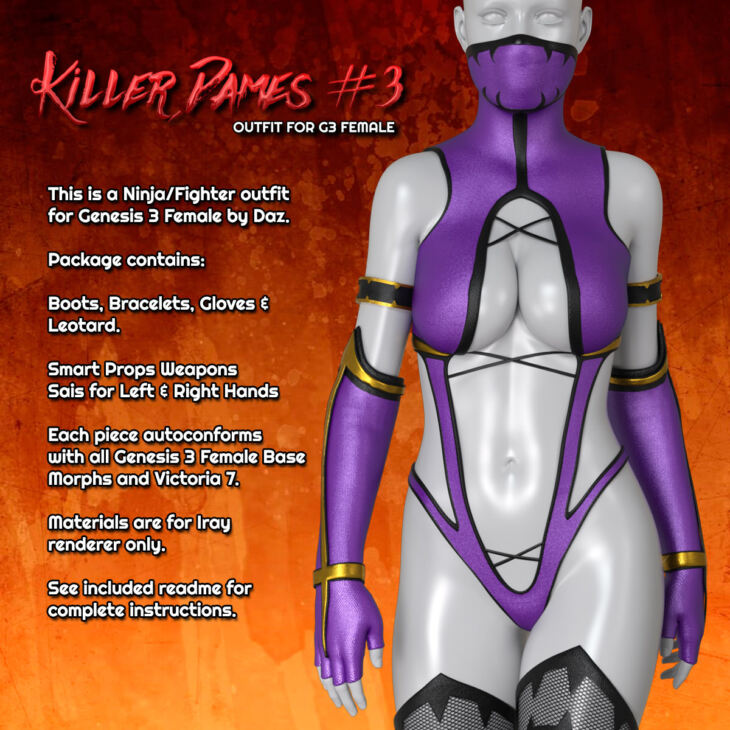 This Package contains the "Killer Dames #3" set of meshes for Genesis 3 Female for use with Daz Studio and Iray.