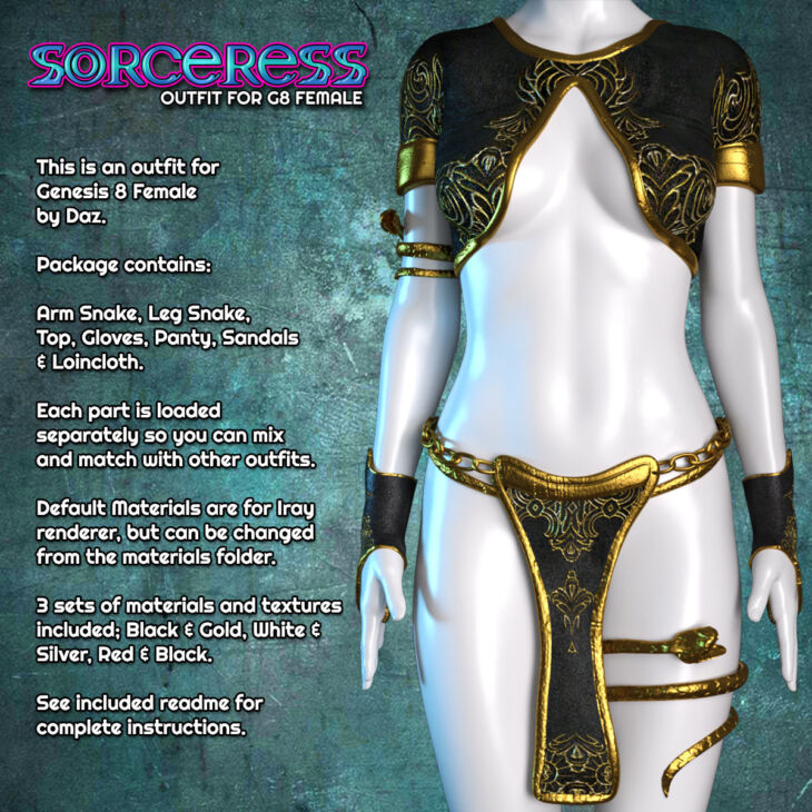 This is a very detailed set of meshes to create a female sorceress. Perfect to mix and match with other accessories.