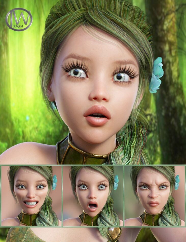 Fairytale - Expressions for Genesis 8 Female and Rynne 8 contains 40 detailed and realistic expressions for Rynne 8 and Genesis 8 Female, divided into categories: Angry, Happy, Sad and Surprised.