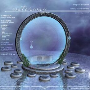 Fantasy Waterway is a 9 piece set. There is two preload option for Iray and for 3Delight, or you can load separate props.