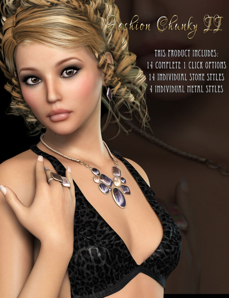 Fashion Chunky Jewelry II is the perfect addition to your Genesis 2 Female character's wardrobe and the perfect complement to Fashion Chunky Jewelry I for that fashionable big, bold look.