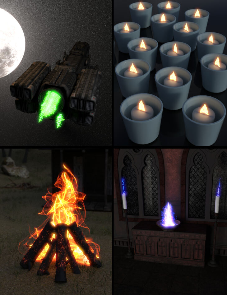 SickleYield brings you more great flame effects for Iray, now with bones! Fast Flames Iray II brings you 20 unique flame props with bones for movement, plus blue and green versions AND a campfire with 3D logs for greater realism.