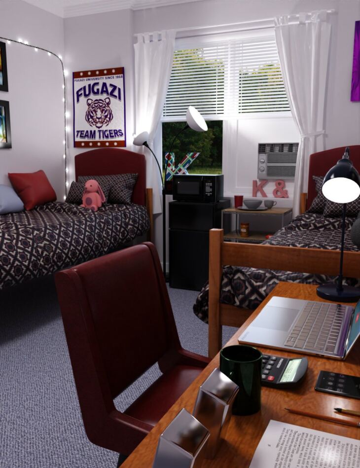 The FG College Dorm Floor includes 3 separate dorm rooms, one full and ready with a food and gaming area. Lots of props in this one.