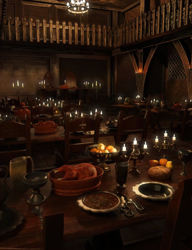 Ready to render with ambiance lighting, the FG Medieval Great Hall comes with a specially designated place for the King and Queen or leaders elevated at the front, as well as a dazzling array of Medieval, historic, and renaissance styled props. As a bonus, you also get a Preload table preset as a time saver.