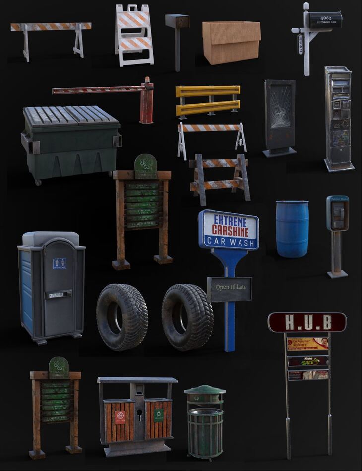 Enhance any outdoor environment with this pack of over 60! Props of everything you'd expect to find on the street, including signs, barricades, boxes, poles, bins, and much more.