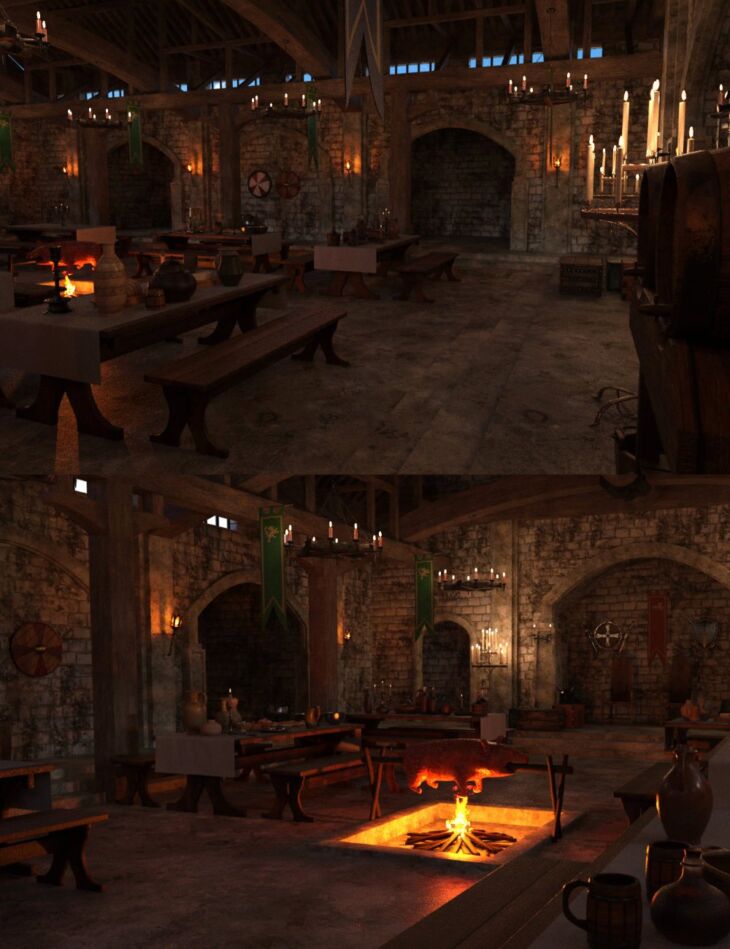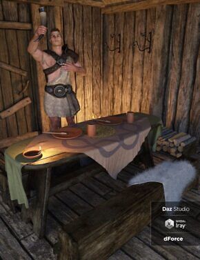 Explore Viking history with this traditional FG Viking Hall! It comes with numerous props to decorate the hall to your liking, as well as presets and texture maps. Whether your characters are celebrating or holding a war meeting, bring them all together in the FG Viking Hall.