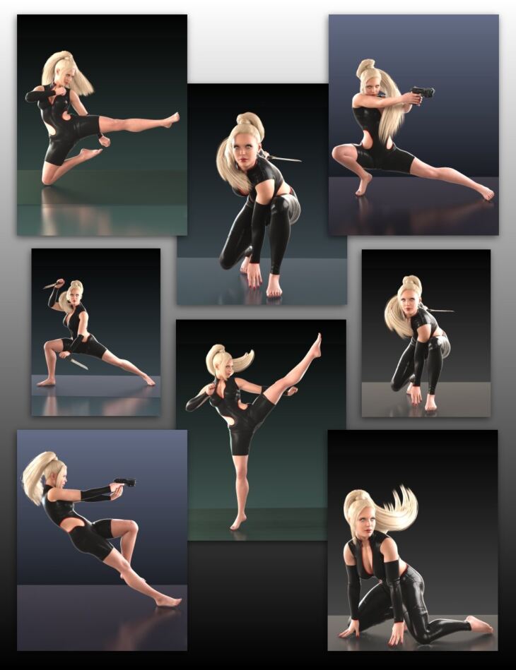 Fighting Action Poses for Genesis 9 and 8 Females by Handspan Studios is based on real-world motions that will be useful for figure reference and all kinds of images- fantasy, realism, or sci-fi; anywhere you want a realistic fighting pose.