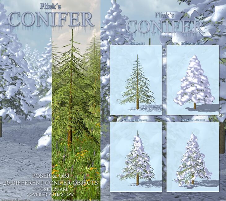 "Flinks Conifer" contains 20 different conifer objects in the Poser and Obj format.