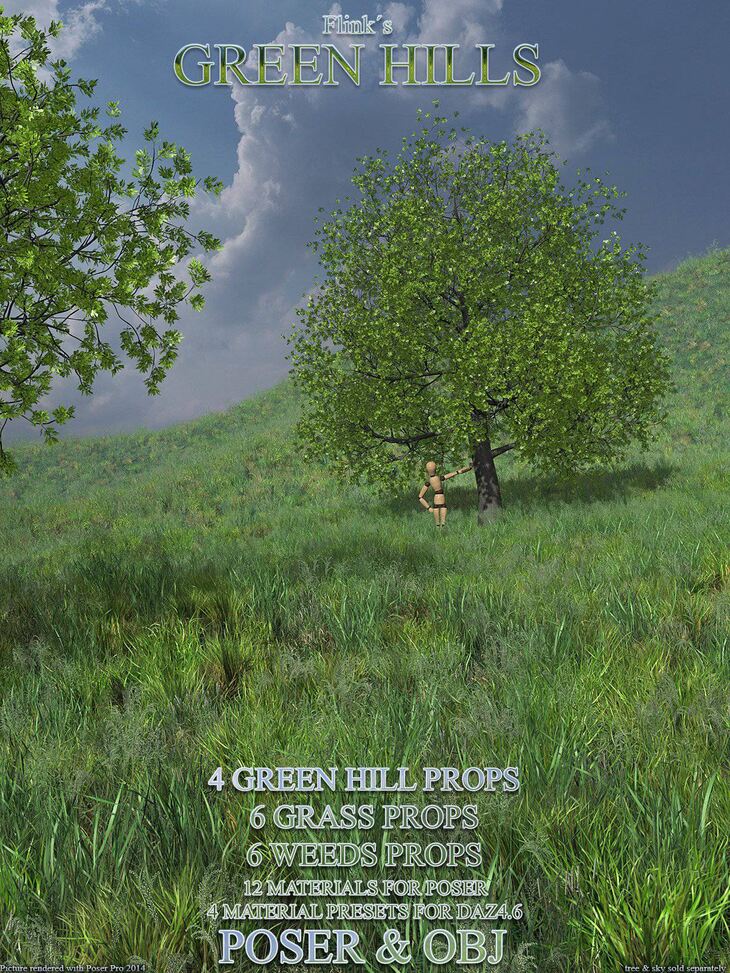 "Flinks Green Hills" contains 16 different objects in the Poser and Obj format.