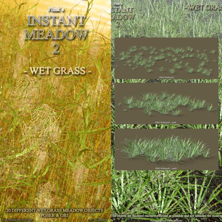 "Flinks Instant Meadow 2 - Wet Grass" extends "Flinks Instant Meadow 2" by 15 different wet grass objects with 5 different types of wet grass and 5 different ground planes.