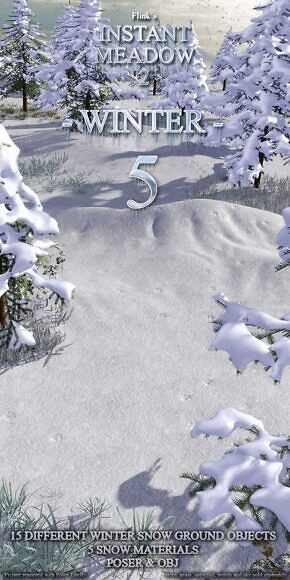"Flinks Instant Meadow 2 - Winter 2" extends "Flinks Instant Meadow 2" by 15 different winter weed objects with 5 different types of frozen and snowy weeds and 2 different ground planes with snow and ice.