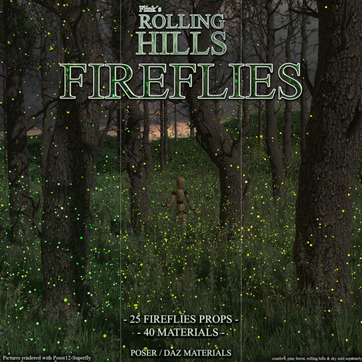 "Flinks Rolling Hills - Fireflies" expands the "Flinks Rolling Hills" package with a total of 25 fireflies props and 40 poser materials.