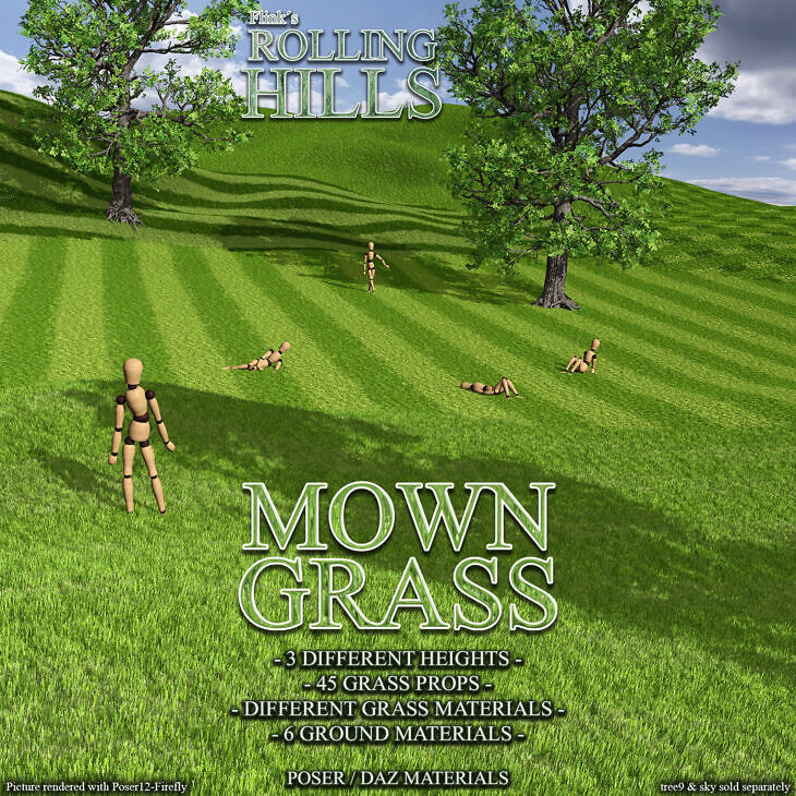 "Flinks Rolling Hills - Mown Grass" expands "Flinks Rolling Hills" with mowed grass in 3 different heights - a total of 45 new grass props and 6 new ground materials in the Poser format.