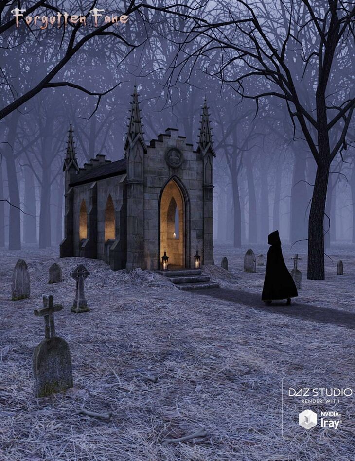 Forgotten Fane is a 360-degree environment featuring a small gothic chapel in a foggy forest. All objects shown in in the promotional images are included in the set (minus figure and clothing).