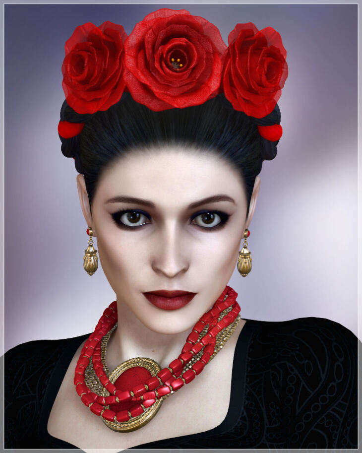 Inspired by Mexico's most famous woman painter Frida Kahlo and her impressible hairstyle and jewelry. Hair and Roses are separate so the hair can be used without the flowers in it, or the roses can be moved to different areas.