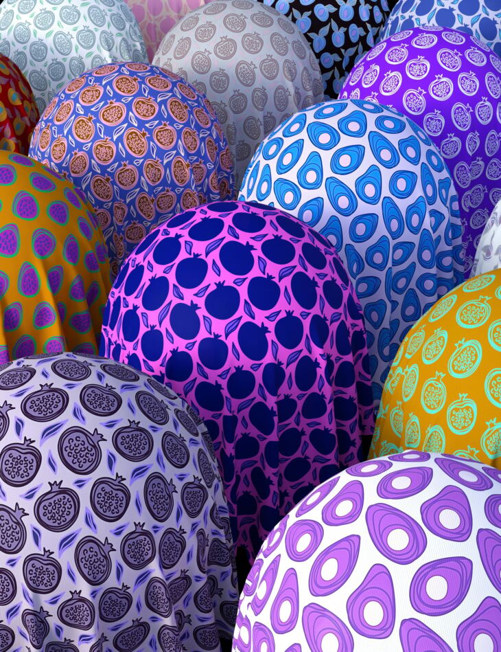 The Fruitilicious Fabric Iray Shaders set includes a variety of fruit-inspired patterns in vibrant colors.
