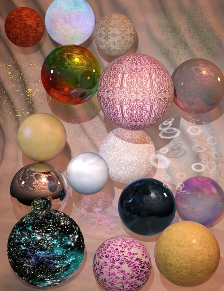 The Sparkly Shiny Shaders include 63 Basic Shaders, 42 Atmosphere Shaders, 20 Layered Image Shaders, and 153 Mix and Match Shader presets. It also includes a backdrop prop and three atmosphere props with materials corresponding to the atmosphere shaders.